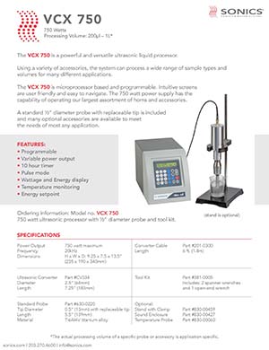 SONICS超聲波液體處理器 VCX750,可安全處理各種有機和無機材料,從250微升升至1升*。典型應用包括納米技術(生產納米顆粒材料和石墨烯分散體),細胞裂解,樣品制備,均質化,ChIP測定,乳化,解聚和解聚,以及聲化學液體處理領域的應用。